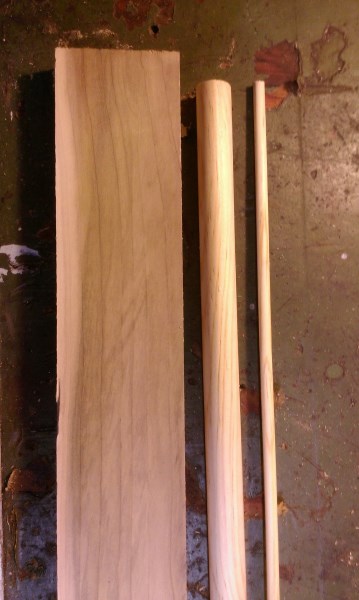 I started with some very basic lumber: a 1x6x8 piece of poplar, a 3/4″ pine dowel and a 1/4″ dowel.