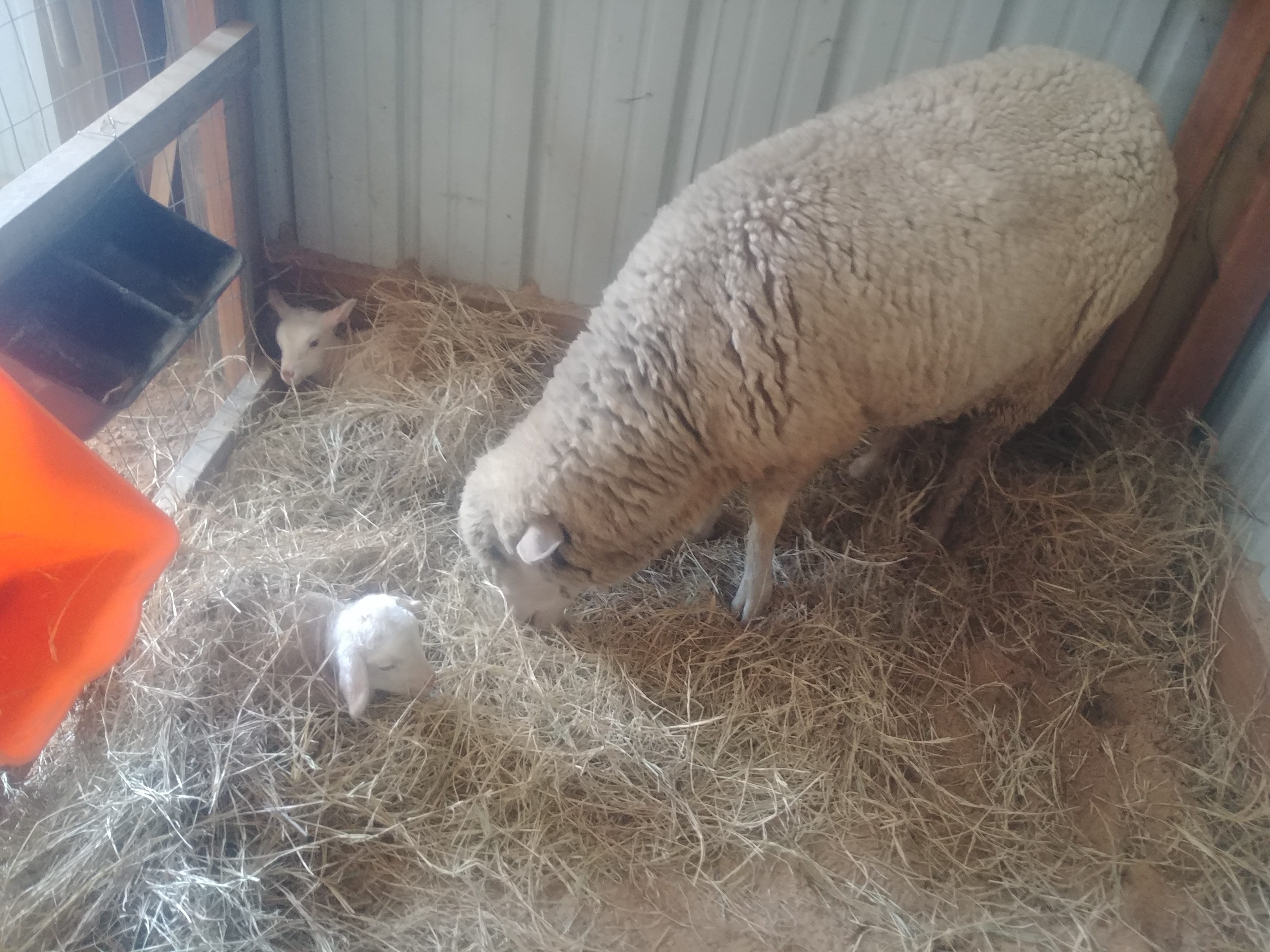 This weekend, a cold front blew in again on Saturday and this morning we found Wendy standing even more proud with her twin babies, Ari (boy) and Ariel (girl). It is interesting to note that last year Wendy had a set of twins ( a boy and a girl) as well. All our other ewes, so far, have had singles. Time will tell what other lambs are in store for us this year, but needless to say, it is a very exciting part of our year.