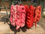 We have now begun hand-dyeing some of our wool. It feels a little nerve-racking to dump a braid of our lovely wool into these first few pots of dye not knowing exactly how it is going to turn out. Thankfully we are pleased with the initial results. There is room for improvement, but this wool takes color quite beautifully and we can’t wait to see how it looks once it is spun. It may take us some time to get these new items added to our store, but if you would like to be one of the first recipients of Whirl’d Works Dyed Wool, please contact us for details. The first two colors are a sort of Cherry-Pink and Tangerine. They look great in the photographs but even better in person!