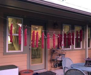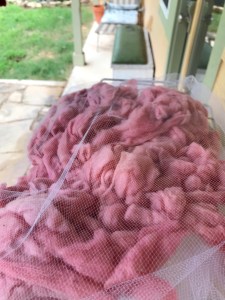 I had quite a bit of dye left in the pot. So I added another 8 skeins of yarn to the dye pot and removed it when it was a pretty raspberry pink color. and repeated the steps mentioned above, with this batch. There was still dye left on the pot at this point, but not too much, so I found 5 oz of roving and put it in the pot until all of the dye was soaked up. The roving came out a really pretty dusty pink rose color.I wrapped some netting around it to dry out side because the bugs really like to get nestled into the roving when I leave it out to dry.