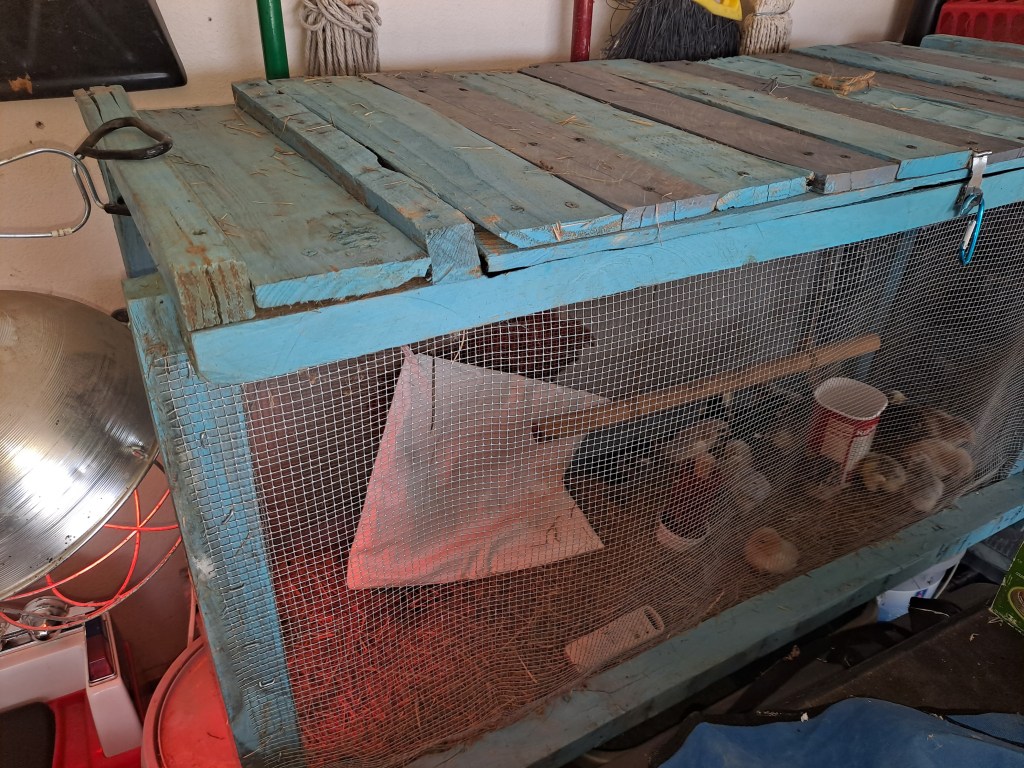 After a week in a rubbermaid tub, in the laundry room, our chicks graduated to the chick coop in the garage.