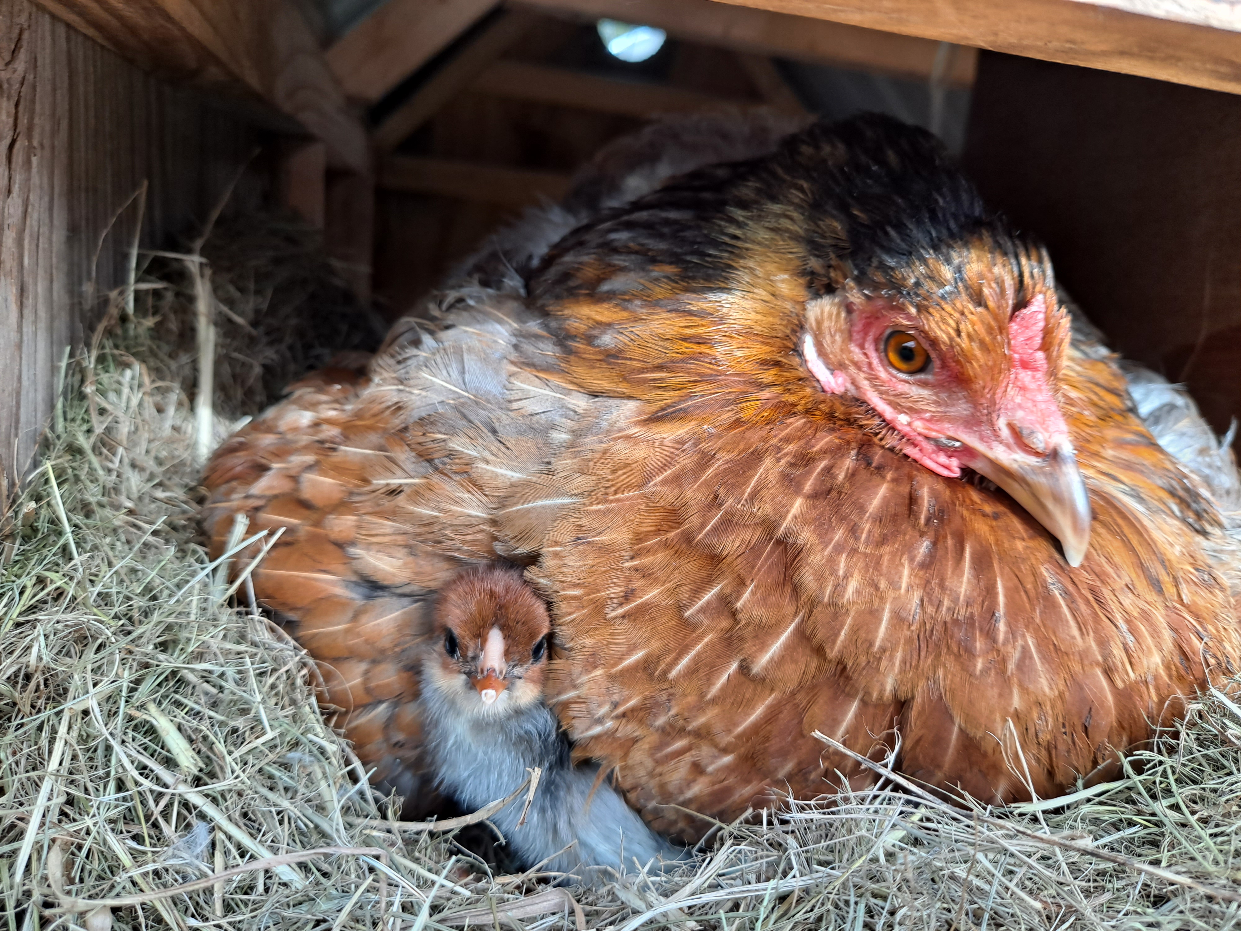 In little news we have 3 little peepers that our broody mommas have hatched on thier own. We learned that if two mommas go broody at the same time, while they might sit next to each other on the eggs for weeks, once one is done sitting and starts raising her brood, she will kill any thatvthe other hatches. So we have had to separate the momma that’s done sitting on eggs, and her 2 chicks from this one. And now she has one of her own, that the other one won’t kill:) super cool that this one looks like her too. Not all of the eggs she us sitting on will have been laid by her. We have a good mix of chickens in thier coop so none of these are pure bred.