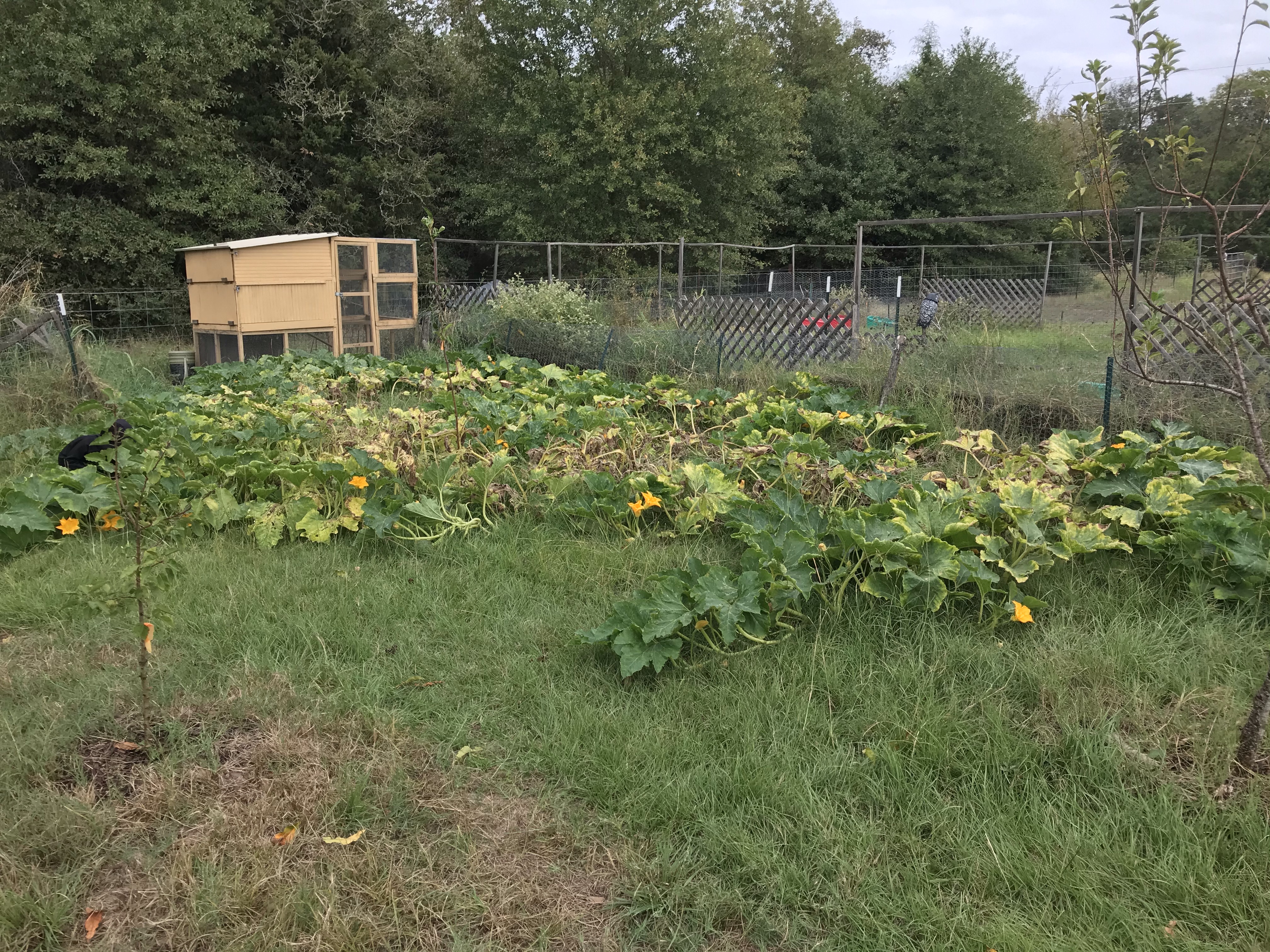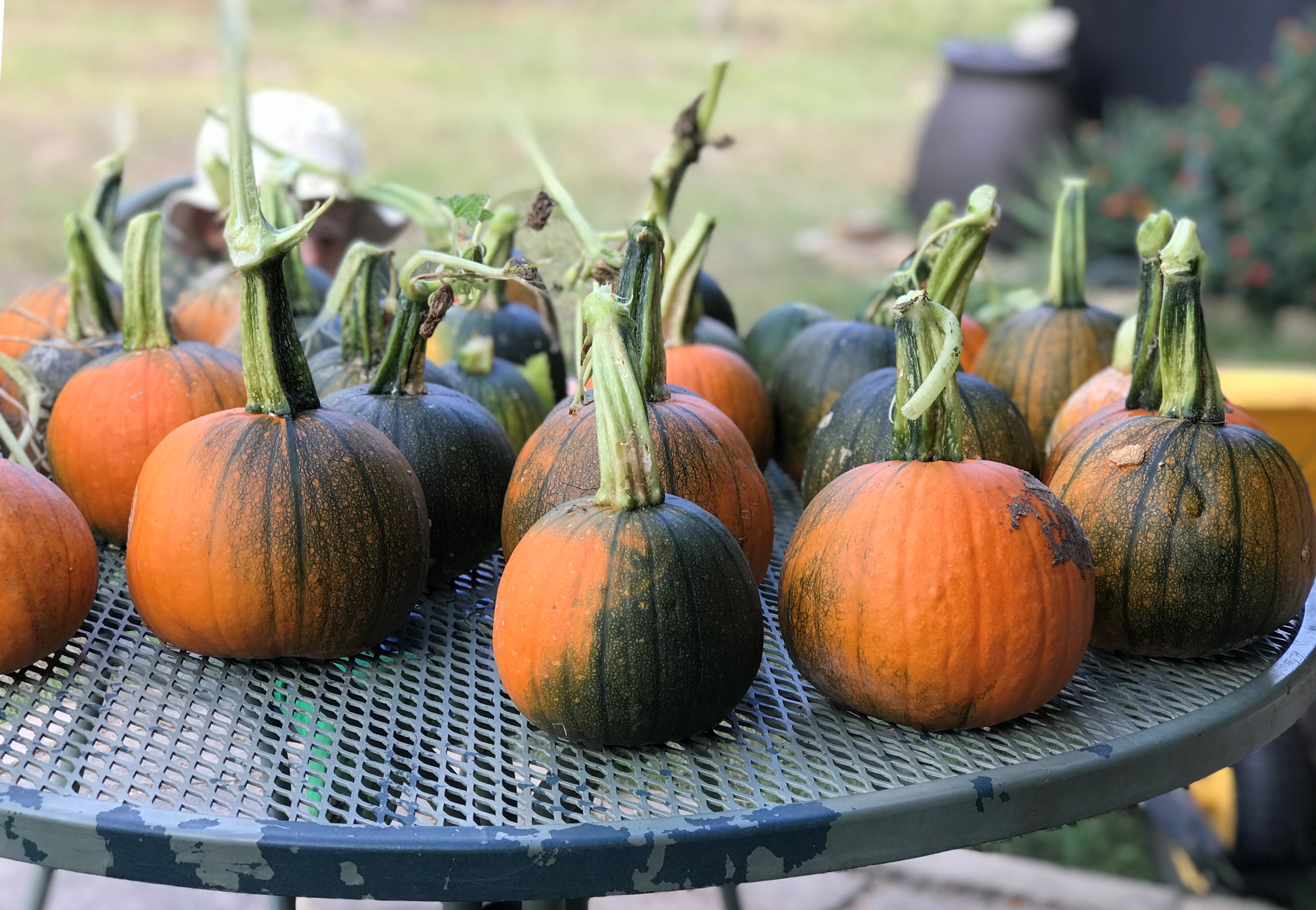 This year we did not plant pumpkins at all. We planted tomatoes, butternut and acorn squash, black eyed peas, brussel sprouts, kale, celery, jalapeno and bell peppers, basil and cucumbers (which the gophers really, really liked). We also enjoyed some wild plums and dewberries, wild grapes, which we made into jelly and even wine, and some blueberries and blackberries that are still growing in the garden.